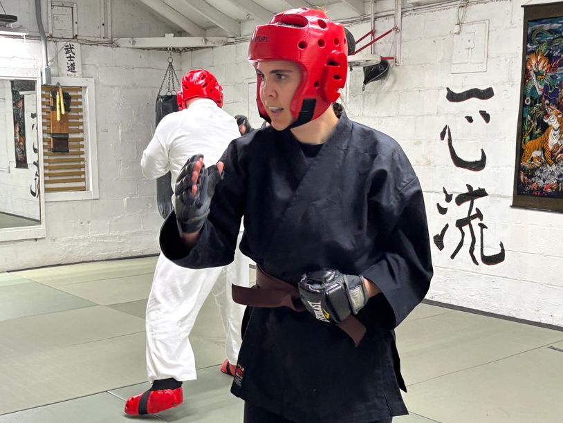 Kumite, or "sparring", is the free-style application of the techniques found in both Basics, and Kata. Sparring with a live opponent, or partner, has the added advantage of helping to develop quick reflexes, physical stamina, and crucially, employing all of the senses in a rapidly-moving engagement. More importantly, the consistent practice of sparring helps to cultivate inner calm and relaxation. One learns to sideline one's emotion in service of more effective and targeted techniques, as well as improved, consistent, and controlled breathing. The long term effect of proper development all of these physical and mental disciplines can mean the difference between danger and safety in a bona fide self-defense situation. Sparring in the dojo will always begin and end with a bow, a sign of respect, to one's sparring partner.